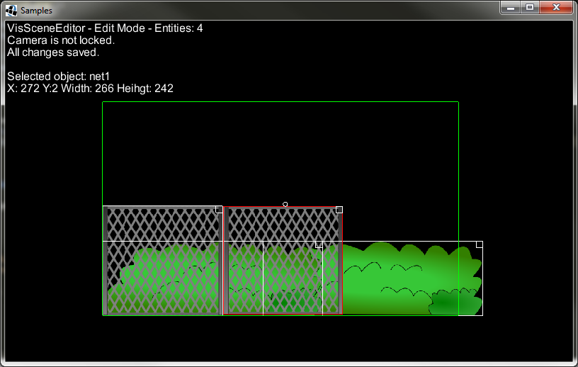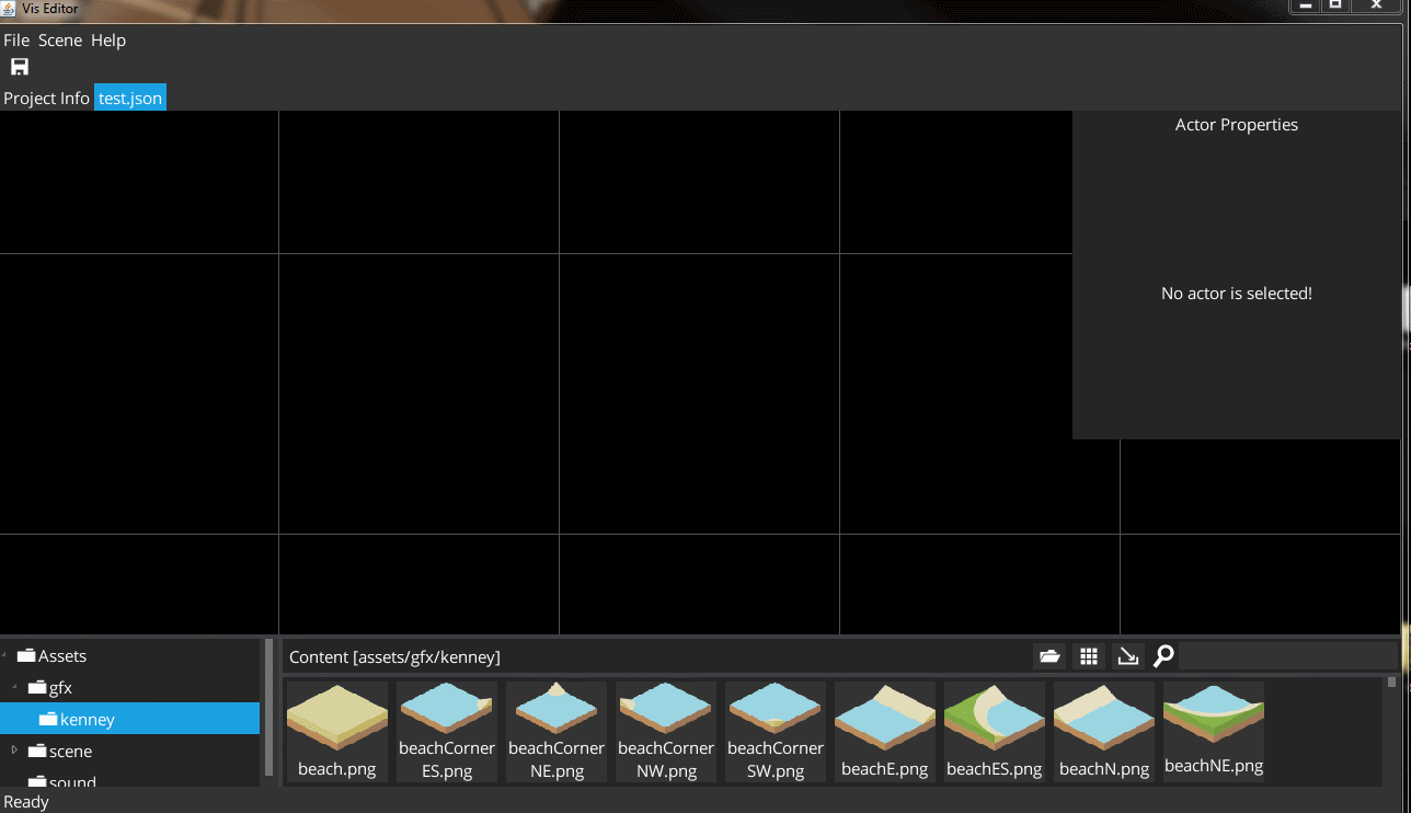 VisSceneEditor was a prototype of VisEditor. It allowed moving, resizing and rotating objects on scene. It was running on top of LibGDX game, so editor view was actually in real time. Work flow with it, was like this: open game, enter edit mode, place objects where you want them to be, save scene. Next time you will open your game, saved scene will be load automatically.